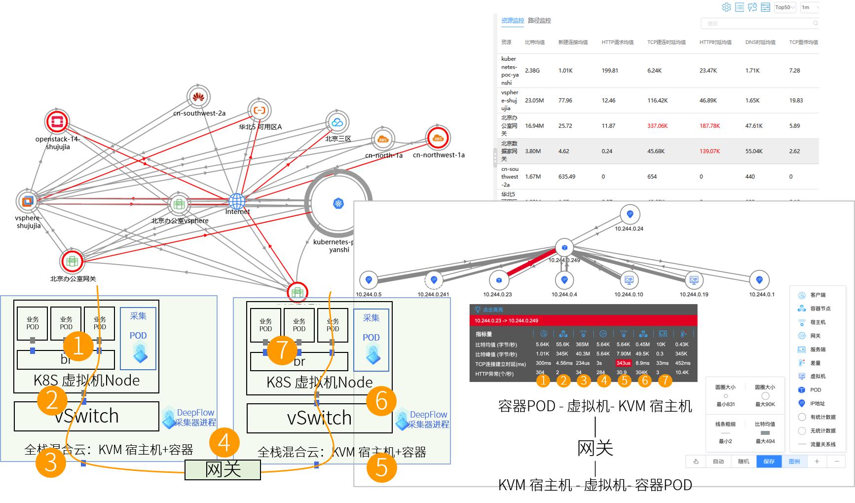 容器、虚拟机、宿主机的结合,也是常见的全栈场景,产品通过“全景图”不同维度的查询展示来描述各层面的关系。图中的“点”可以是数据中心、可用区,可以是虚拟机、容器POD,可以是VPC、网段、IP,也可以是Service、资源组等。“点”与“点”之间的连线可以设置为流量、调用关系的吞吐、延时、TCP连接状态等指标。当看到两个容器POD的连接延时超过阈值时,客户面临的是一个复杂的全栈环境,涉及到POD、Bridge、vSwitch,再到东西向的Gateway,中间已进行过多次地址转换。DeepFlow清晰地将每一步的指标呈现出来,快速高效地定位问题点。这就是云杉为客户提供的全栈跟踪能力。
