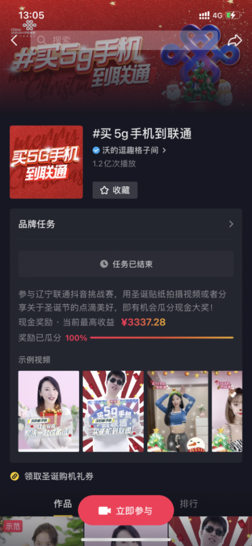 此次辽宁联通突破传统品牌宣传手段,通过抖音挑战赛+全民任务组合营销新模式,以10万元奖励机制,激发用户参与热情,快速俘获大量优质内容,使整体话题播放量达1.2亿+。#买5g手机到联通 一时间火爆刷屏,给用户留下深刻印象。