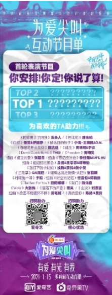 今日,橙心优选《2021爱奇艺为爱尖叫晚会》正式官宣了“为爱尖叫互动节目单”及互动投票规则。本次晚会将节目顺序、艺人舞台、观看画面视角等决定权完全交给用户,力求让每个人亲身参与,定制属于自己的晚会。目前,投票规则和首轮表演节目助力榜已重磅开启,在节目单正式发布后,新浪微博、豆瓣等社交媒体已经激起了用户热烈的讨论和期待。官方微博互动转发量瞬间过万,微博话题阅读量更是超过2000万。