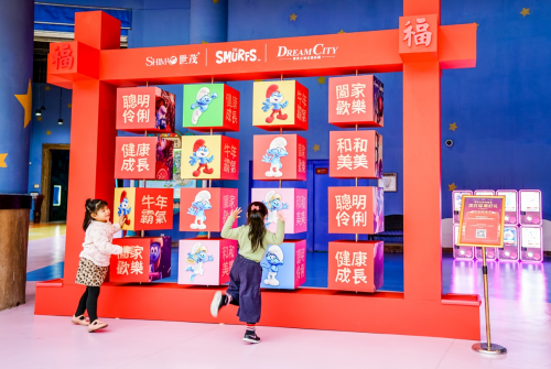 蓝精灵乐园增添了寓意好彩头的趣味互动体验,转出开年好运的“精灵转转乐”,游客可以转动红色方格拼出“精灵五福闹新春”年画、蓝精灵与福字巧妙结合的剪纸风窗花、寓意美满的新年祝福和可爱的蓝精灵。