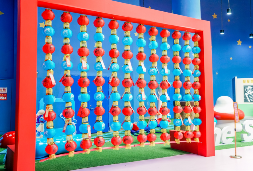 红蓝交错的灯笼挂着新春灯谜,游客参与“精灵猜猜乐”揭下谜面,猜对灯谜后可以获得精美的新春礼品,在游玩之余还能感受一把传统文化的魅力。最后来到 “精灵步步高”互动体验,游客在蓝精灵福字背景墙前,随着脚步的交替,感应屏将会变幻色彩,企盼来年吉祥如意、步步高升。