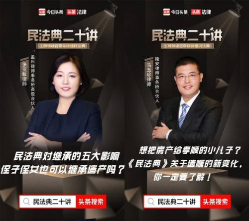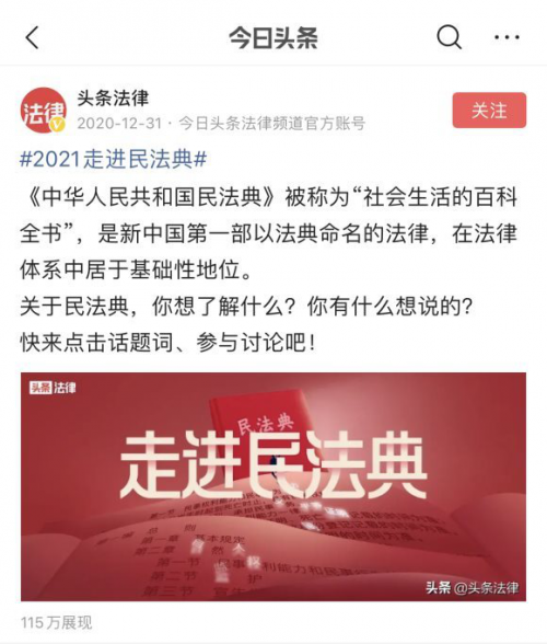 为了帮助用户更好地了解民法典各项具体条例,今年年初,今日头条法律频道发起了“走进民法典”系列普法活动。