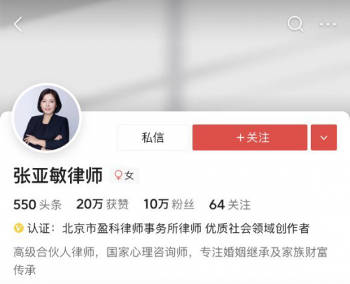 @张亚敏律师,深耕婚姻家事领域,从社会热点中为头条网友带来婚姻家事法律的解读,打造出了多个百万视频爆款。