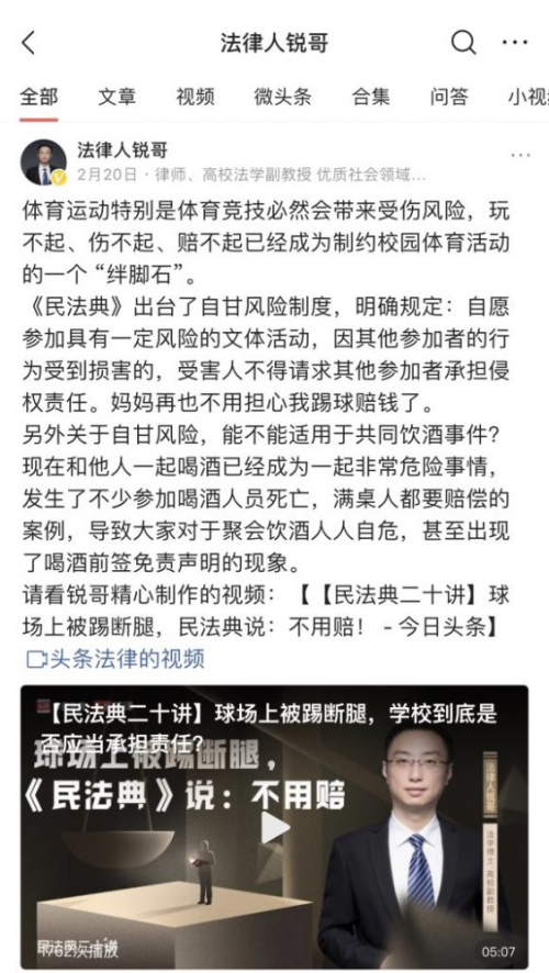 头条法律创作者@法律人锐哥解释道:“体育运动特别是体育竞技必然会带来受伤风险,玩不起、伤不起、赔不起已经成为制约校园体育活动的一个‘绊脚石’。《民法典》出台了‘自甘风险’制度,明确规定自愿参加具有一定风险的文体活动,因其他参加者的行为受到损害的,受害人不得请求其他参加者承担侵权责任。”