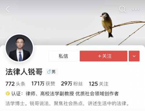 @法律人锐哥通过坚持每天创作、坚持专业化、坚持学习,实现入驻6个月粉丝从0到24万的突破,成为头条法律领域头部创作者。