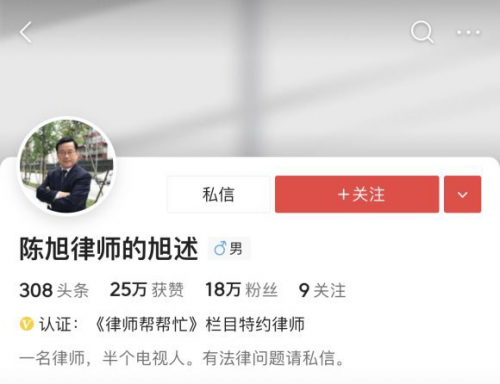 中央电视台法制频道和北京科教频道合作嘉宾陈旭律师 @陈旭律师的旭述时常从粉丝的留言中得到灵感和素材,践行着用法律帮助别人的初心,让他科普创作更加丰富、具有针对性。目前,他的头条号已经获得18万人的关注、点赞。