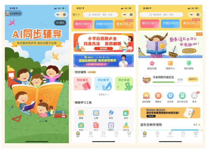 对于学龄前儿童而言,小程序中内置了丰富的涂色本、识字卡、绘本等彩色打印素材,趣味培养分分钟;孩子上小学之后,复杂点的口算题、手抄报、古诗词 等彩色打印素材也是丰富多样,快了学习不是梦;等到了中学阶段,各大考试接踵而至,小程序中则是可以轻松get “九门功课同步学”的配套教材试卷习题练习册、帮助加强知识点记忆的思维导图公式、拍照自动生成的错题积累本,全面提升更轻松~