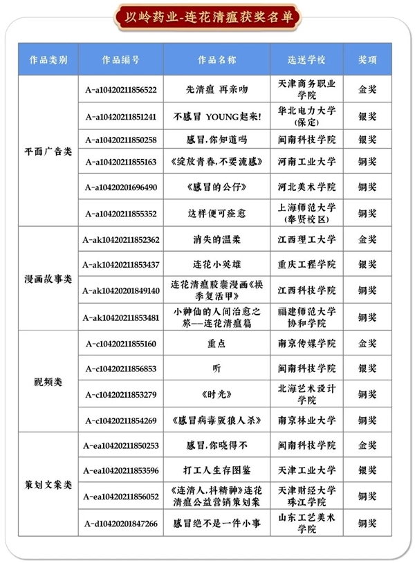 2021年秋,以岭药业-连花清瘟以“连花伴青春”为命题,面向广大青年开启创意征集,号召年轻人追求健康生活,拒绝感冒流感,时刻保持青春活力。活动现场,广告人文化集团董事长李文龙先生揭晓了连花清瘟命题等级奖获奖名单。
