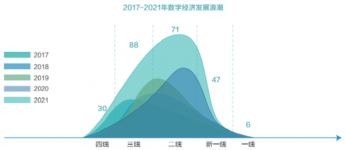 在评估的242个城市中,尽管数字经济一线城市的发展水平仍旧遥遥领先,但大批城市也实现了“三级城市台阶”的跨越,新一线城市数量增长62.1%,大批二线城市开始向新一线集中,其余城市快速向二线靠拢,三线、四线城市持续增多,形成了“一浪紧似一浪”的态势。
