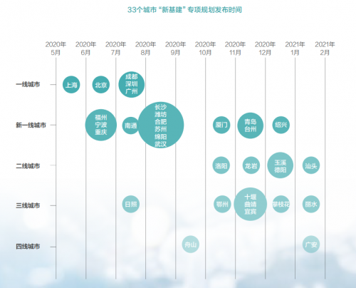 在城市数字经济发展热潮的背后,是各个城市在数据及信息化基础设施上的持续投入。例如,一线、新一线城市在5G网络建设上遥遥领先,大部分城市也已建成了城市或行业大数据平台,并且陆续发布了各地纷纷出台数字经济、“新基建”等相关政策和规划文件。