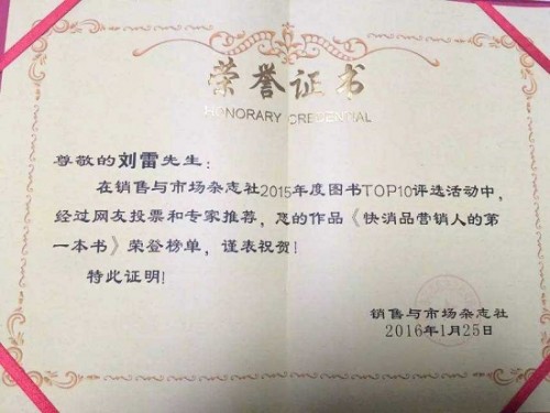 他是这样说的,也是这样做的。2015年刘雷受邀出版了自己的第一本论著——《快消品营销人的第一本书》,将自己的从业实战经验系统地分享给千万营销人。这本书至今仍在各大书店、网店畅销,并被众多企业做为实战营销内训的教材,稳居同类图书销售排行榜前列。在权威媒体《销售与市场》杂志社2015年度图书TOP10评选活动中,刘雷的“第一本书”经网友投票和专家推荐荣登榜单。