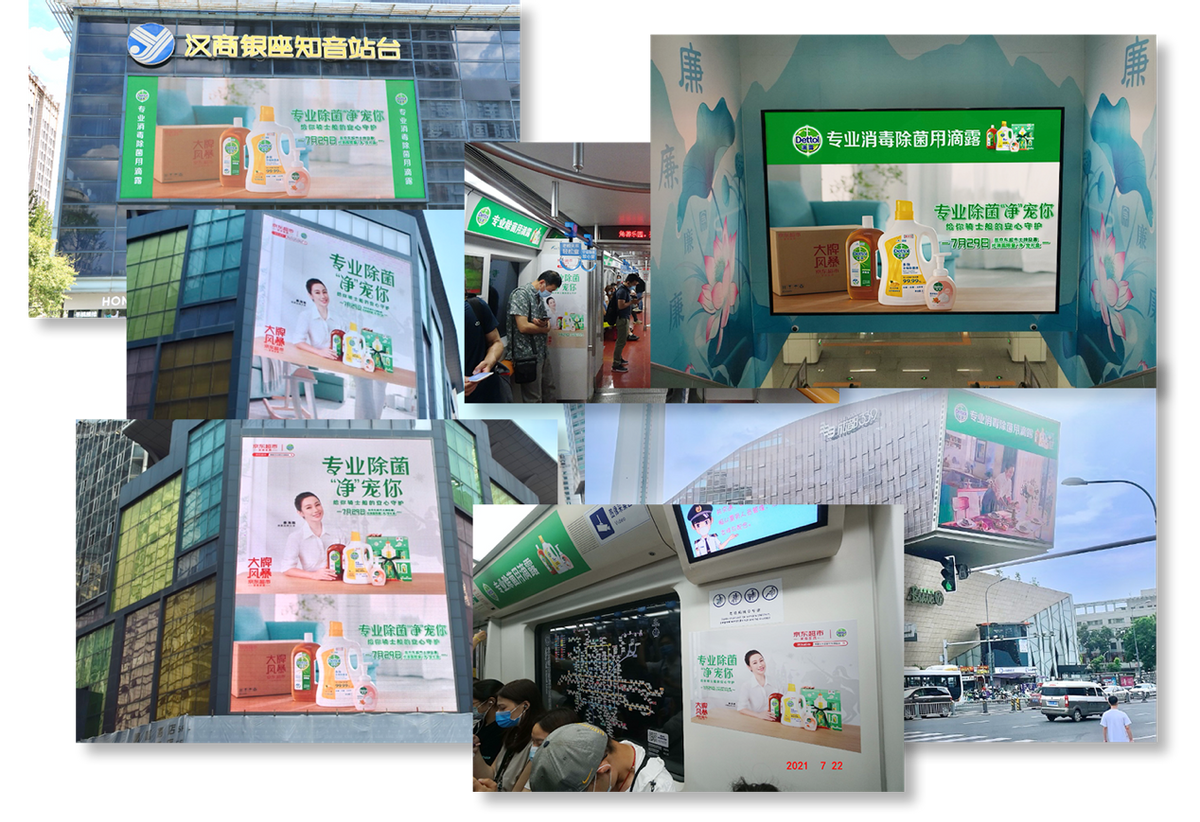 滴露还将甜宠剧场视频投放于十大一二线城市核心商圈LED大屏及地铁列车中,通过霸屏交通枢纽线路的方式,在进攻核心人群的同时,深度挖掘城市里的机会人群,以创意视频传播最大化,宣扬「专业除菌“净”宠你」的口号,将“安心守护你的骑士”这一品牌形象传递到消费者心智。通过站外强大曝光,为引流京东超市大牌风暴蓄势,创造流量入口!