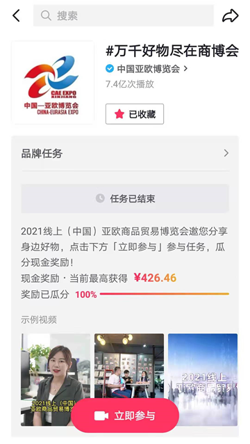 在巨量引擎助力下,2021线上亚欧商品贸易博览会(以下简称为2021商博会)就实现了顶尖声量共振,打造了全民大事件。2021商博会由乌鲁木齐市政府承办,以“构建丝路商贸平台 助推经济合作共赢”为主题,首次“跃上云端”,成为促进区域内各国经贸合作的重要平台。携手巨量引擎,此次商博会以“万千好物”为活动内核,打出“话题挑战赛+全民任务”组合拳,极大提高了在疆内外的影响力和大众参与度,为国内城市政务传播提供了新示范。