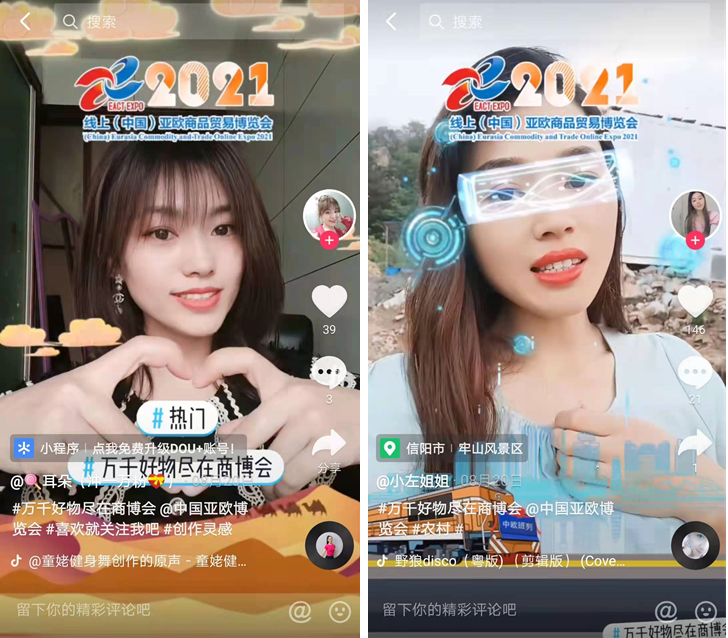 抖音平台的政务传播,首先需要开通官方账号,搭建内容创作、用户互动的营销阵地。2021商博会于开幕前,便已在抖音、今日头条开通了官方账号(@中国亚欧博览会),上传展会预告和盛况、参展企业形象、参展商品等内容,通过搭建双端官方阵地,为其线上活动打造流量入口和内容枢纽。