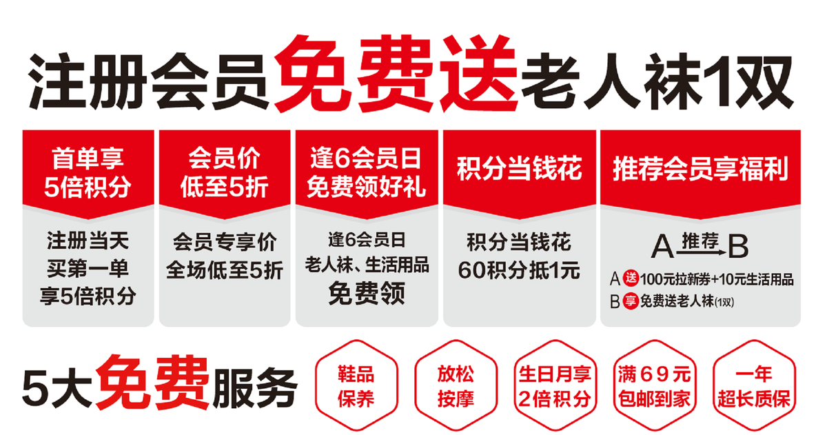 足力健作为老人鞋行业领导者,始终以用户为核心,围绕老人穿鞋需求,创新研发出专业、舒适、丰富的老人鞋产品。足力健始终把老人的需求放在第一位,立志通过自己的产品为老人创造更美好的体验,让每一位老人都过上健康快乐的老年生活。足力健老人鞋超行业标准的质保,是产品能在老人群体中不断“圈粉”的重要原因,好产品不怕承诺,足力健老人鞋给用户大胆承诺:一年内开胶断底,免费旧鞋换新鞋,超预期的超长质保,让选择足力健的用户不再有后顾之忧。足力健老人鞋坚持的半跪式极致服务,给用户带来了更好的试穿体验,企业邀请拥有36年资深售鞋经验的日本第一位女性售鞋顾问——久保田美智子做探店培训,将专业的服务、科学的店铺陈列普及到一线员工,提升了老人鞋行业的服务标准。足力健全国门店提供的鞋品保养、放松按摩、生日月享2倍积分、满69元包邮到家、一年超长质保五大免费服务,也体现了企业对用户的用心。
