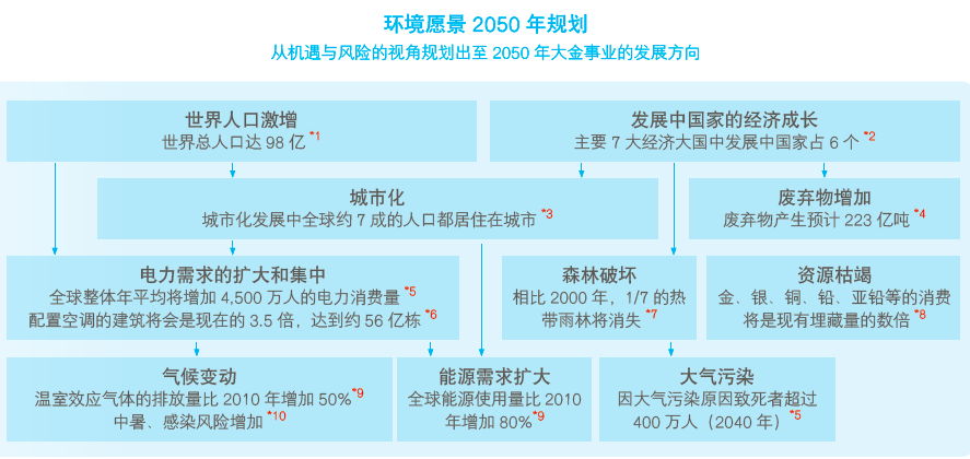 当前,世界正处于大发展大变革大调整时期,气候变化、人口老龄化等全球性议题都使得社会经济发展走向更加难以预测。一方面,世界人口急剧增加,越来越多的人涌向城市中心,将会带来电力需求的扩大和集中,全球整体年平均将增加4500万人的电力消费量,配置空调的建筑将会是现在的3.5倍,达到约56亿栋。与之相对应的,温室效应气体的排放量将会比2010年增加50%,还会伴随有中暑、感染等环境风险的增加。另一方面,世界上有130多个发展中国家,主要7大经济大国中发展中国家占6个,仍处在依靠工业进行经济发展时期,经济的增长会伴随着大量废弃物的产生和资源消耗,相比2000年,预计1/7的热带雨林将会消失,全球环境问题日益严峻。