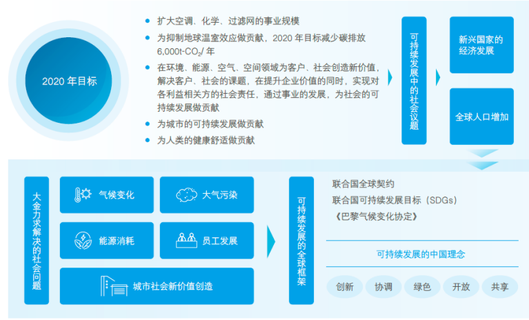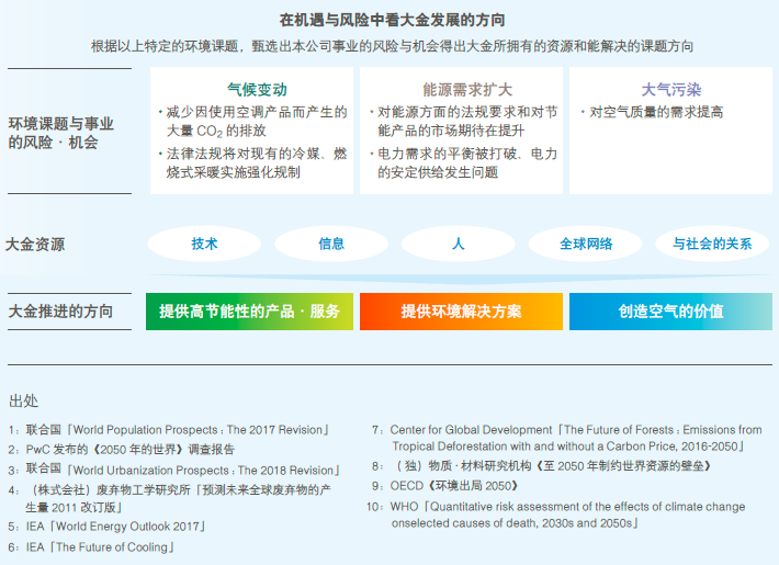 面对如此严峻的环境问题,大金以高度的责任担当和具有前瞻性的目光,较早地提出并制定出台了“环境愿景2050”长期规划,目标到2050 年在全球的事业活动及产品服务中实现温室气体净“零”排放,依托大金现有的技术、信息、人等资源,从机遇与风险的视角规划出至2050 年大金事业的发展方向,为气候变化应对提供健康空气解决方案。