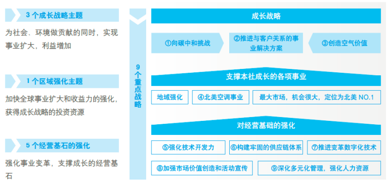 大金时刻关注全球可持续发展趋势,将可持续发展理念融入公司发展战略当中,以每五年为周期制定“FUSION”经营战略规划。在FUSION 20中提到“为抑制地球温室效应做贡献,2020 年目标减少碳排放6000t-CO2/年”,而2020年,大金集团减少温室气体排放贡献量达7000万吨。2021年,大金集团正式推出“FUSION 25”,确定“向碳中和挑战”为三大成长战略主题之一,也进一步明确为实现2030年减排目标的实施计划。