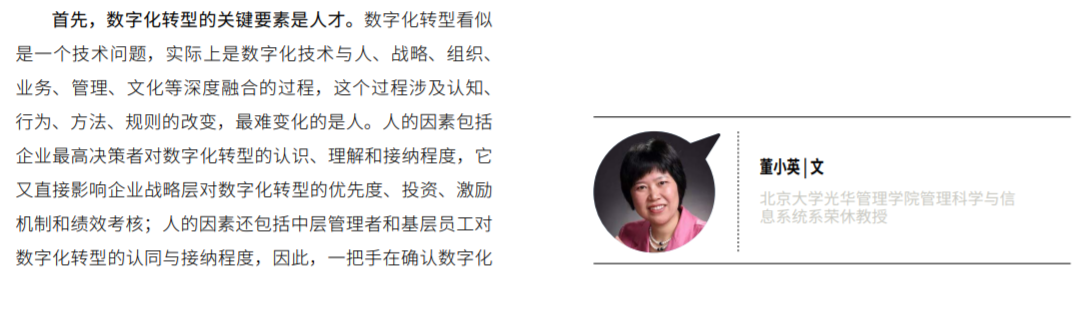 在北京大学光华管理学院荣休教授董小英看来,企业数字化转型需要人才、平台能力建设,以及将数字化营销和数字化运营管理能力内外打通的能力。
