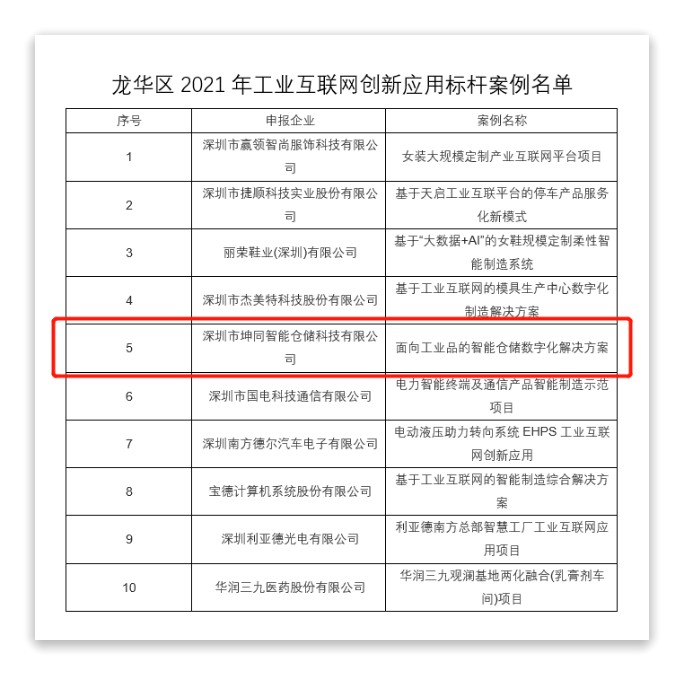 近日,龙华区发布“2021年工业互联网创新应用十大标杆案例”,本次标杆案例的遴选,聚焦工业企业发展面临的关键问题,在重点行业征集并遴选出技术先进、成效显著、能复制推广的应用标杆案例。经过多轮企业现场答辩、专家评审及专家现场核查,坤同以出色的技术优势、服务能力凭借“面向工业品的智能仓储数字化解决方案”从众多竞争者中脱颖而出,成功入选。