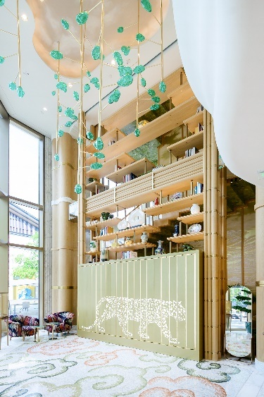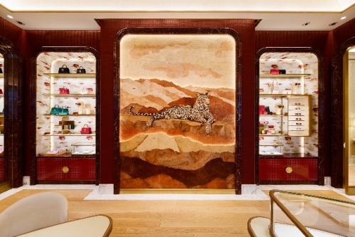 精品店以香槟金色调为主旋律打造室内空间,从本地文化中获取的设计元素比比皆是。精品店门厅 高耸入顶的竹制书架前,映衬翠竹的祖母绿色装饰吊灯高悬而下,地毯上的彩色祥云图案如晚霞般绚丽迷人。标志作品区 中央墙面是盘卧巴蜀山峦之间的卡地亚猎豹,精湛的细木镶嵌工艺呈现浮雕式的立体效果。区域两端的圆形立柱从卡地亚典藏系列的一件香 烟盒得到启发,并加以团寿纹这一传统吉祥图案作为点缀。女士腕表区内, 全手工制作压花皮革祥云图与形态各异的仿中式灯笼吊灯相映,而男士作品区 则从中式古典园林中获取灵感,蟠曲造型的松树与轻逸出尘的竹子彰显高雅风韵。走进婚礼作品区, 迎面可见一面现代风格手工刺绣屏风,其上图案为成都市树银杏的叶片形状,为这一区域注入摩登美感。VIP沙龙 从香槟色系逐渐过渡至优雅的绿色,银杏叶形落地灯成为点睛之笔。