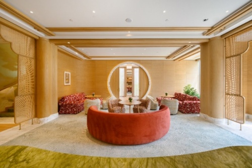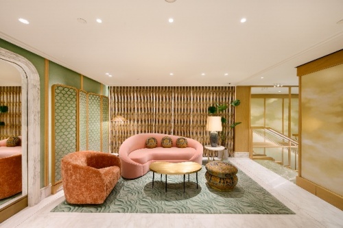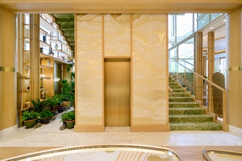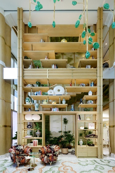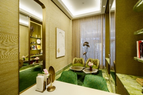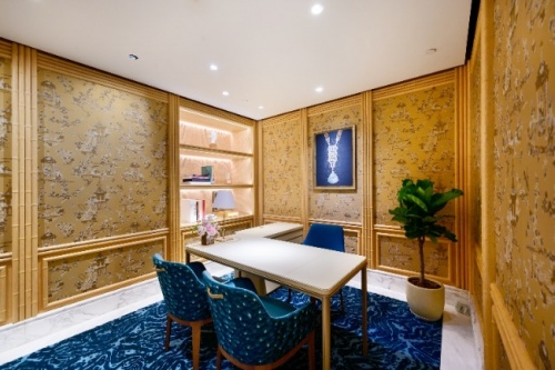 顶层空间旨在为顾客提供个性化定制服务,整体空间运用色彩缤纷的织物打造宾至如归的舒适感。售后服务中心 以绿色为主色调,墙边的银杏叶组合图案屏风由特别的蛋壳细工镶嵌而成。VIP沙龙 从18世纪法国传统室内设计汲取灵感,竹艺框架镶嵌固定中式壁纸图案,彰显中西兼具的古典美感。