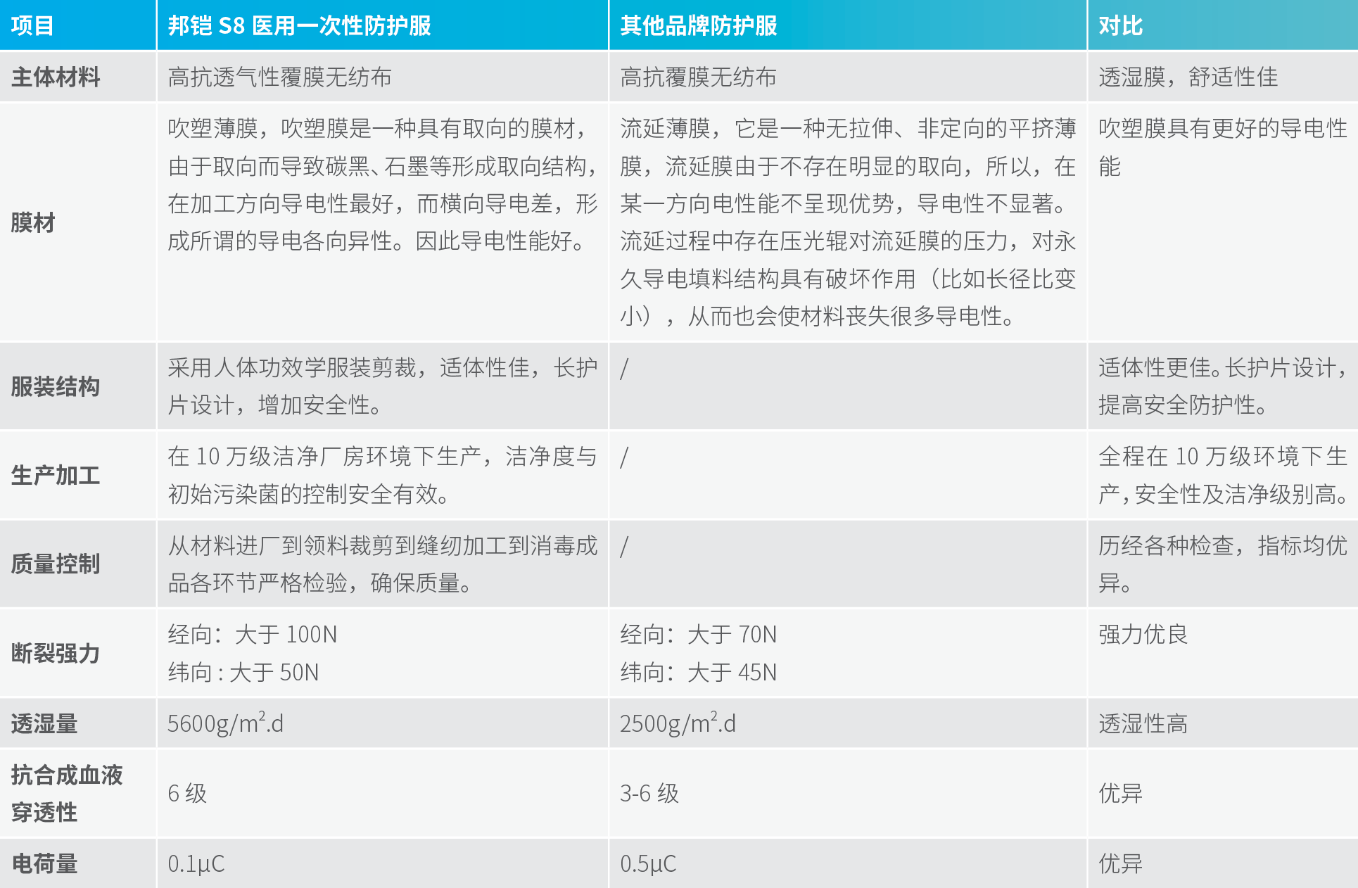 由北京邦维应急装备有限公司生产的邦铠S8医用一次性防护服所选用的原辅料,全部经过严格检验。10 万级洁净厂房及专业的纺织服装生产能力,始终保持着业界高标准的品质要求:防护服采用高透湿、高性能覆膜材料,立体结构剪裁,符合人体工效学设计;透湿性好,穿戴舒适;抗合成血液穿透性优异;其面料的断裂强力经向大于 100N,纬向大于 50N,超过业界同类产品。