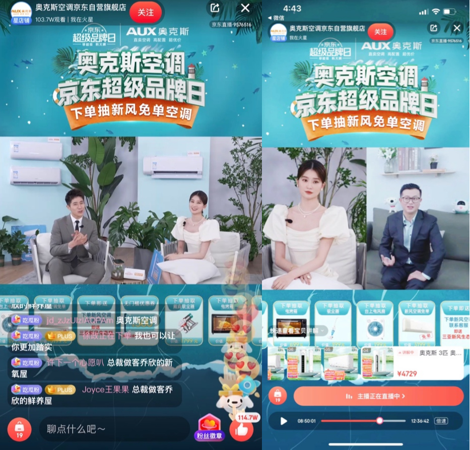 来到5月12日奥克斯空调京东超级品牌日当天,奥克斯总裁做客“乔欣的鲜氧屋”,将整个超级品牌日Campaign推向高潮。总裁、乔欣空降店铺直播间,带来包括新风空调免单、戴森吸尘器等多重福利,收获了消费者的强势围观。