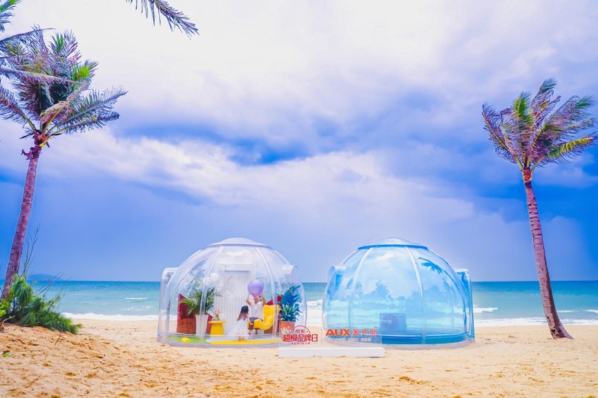 此次来到三亚,奥克斯空调发起“1小时全屋鲜氧挑战”,相当于在海边做了一场有关四季新风空调的产品实验。两个半球形状透明小屋在海边并排而立,它们一间搭载四季新风空调室内机,模拟家居环境,另一间装配四季新风空调室外机,模拟室外环境。挑战者进入模拟家居环境的小屋,打开四季新风空调后正常做瑜伽运动,另一间小屋则用彩色烟雾模拟被污染的室外环境,而后观察两间小屋在四季新风空调运行后发生的变化。