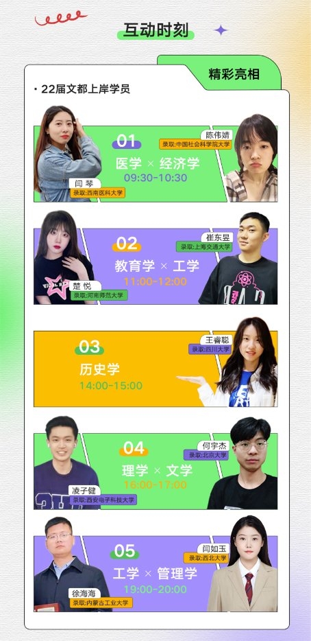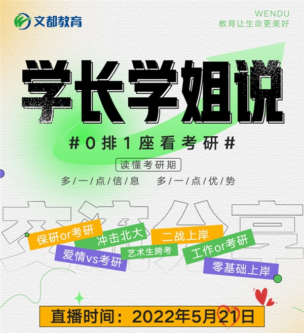 当然,错过直播和没看过瘾的同学也不用担心!5月28日、29日,文都教育还会为大家带来“高分上岸学员&考研大咖分享会”,连续两天、共计四场直播,让你一次看个过瘾!