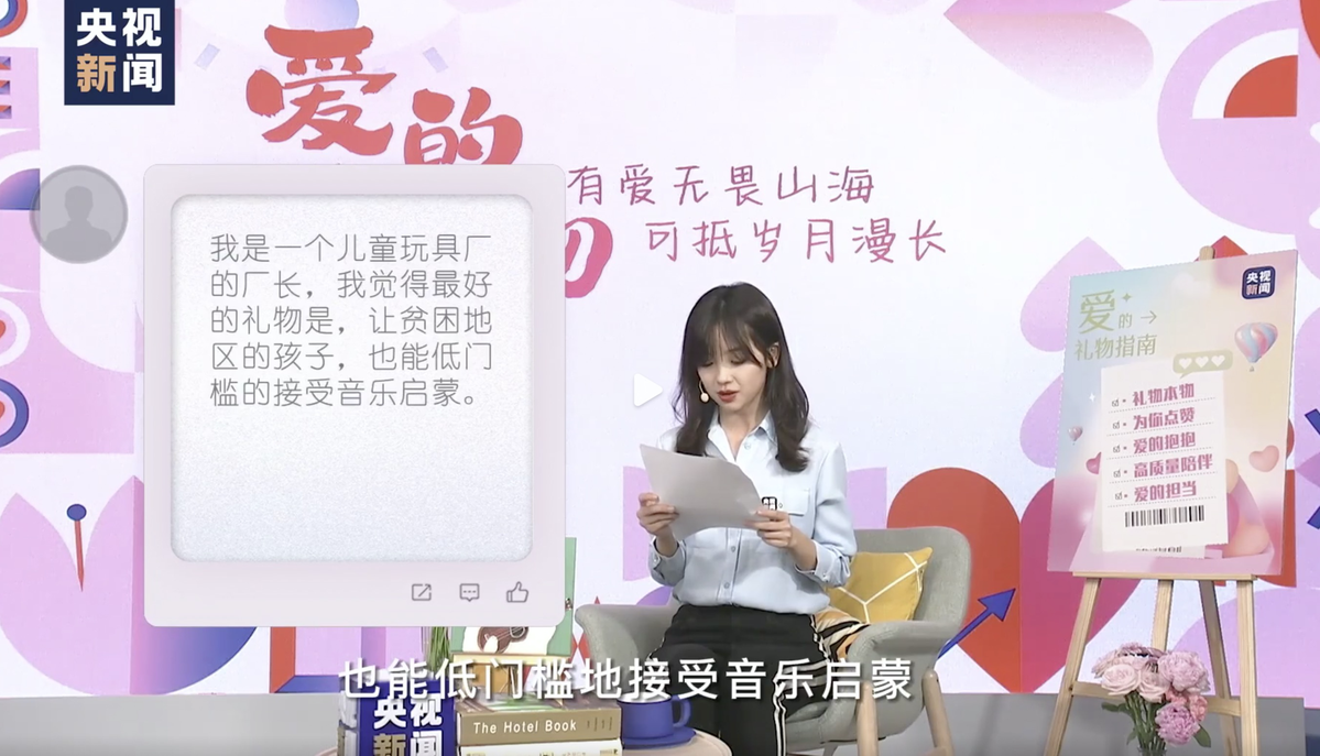 5月20日,在央视《了不起的当家人》节目中,记者王冰冰对话杜绍东,他说,小时候因为想上兴趣班上不起有遗憾。做了玩具后,他不想自己的遗憾在这一代孩子身上重演,他想做出适用于每一普通孩子的乐器。