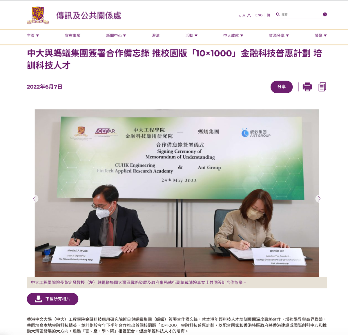 6月7日消息,香港中文大学与蚂蚁集团近期签署合作备忘录,就年轻科技人才培训展开深度战略合作,并拟于今年下半年合作推出首个校园版“10x1000”科技普惠计划,支持香港建设国际创新科技中心,助力大湾区人才建设。