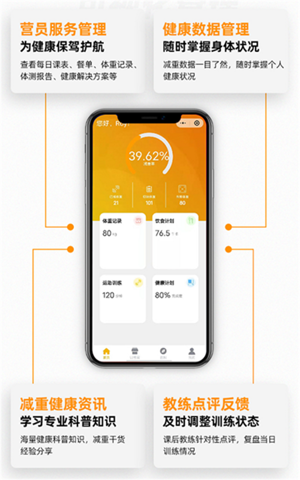 平台包含线下客户服务平台,线上轻食减脂平台,全方位覆盖有减重减脂需求的用户。主要功能包括为用户提供了健康数据的采集、储存和科学化分析等功能,客户购买的产品相关训练课程内容、课销进度、健康问卷、体测报告、运动饮食方案、健康数据对比等。