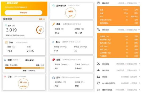 包含饮食、运动、行为作息打卡记录;实时生成打卡分析报告;饮食过量预警;运动强度分析;每周健康报告生成,设立积分奖励鼓励完成健康行为。