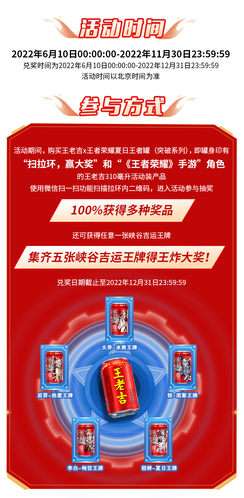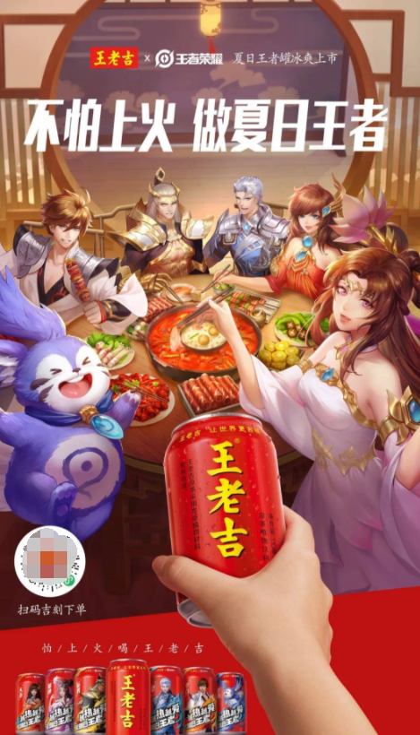 6月10日,王老吉X王者荣耀联合举办#不怕上火 做夏日王者# 跨界营销发布会,现场隆重发布11款王老吉X王者荣耀联名罐以及王老吉X王者荣耀限量联名礼盒(非卖品),王老吉X王者荣耀联名罐分别是“王老吉X王者荣耀夏日王者罐(突破系列)”和“王老吉X王者荣耀夏日王者罐(立绘系列)”。突破系列有五款王者荣耀合作英雄,分别是:李白、后羿、铠、大乔和貂蝉,而立绘系列则有六款王者荣耀合作英雄,分别是:李白、后羿、铠、大乔,貂蝉和梦奇。王者集结,不负热爱。这个夏天,游戏、火锅、王老吉,一起不怕上火,做夏日王者!
