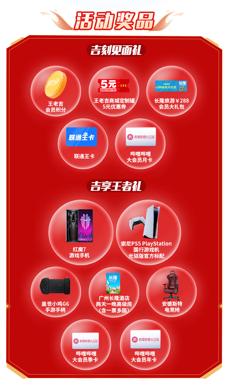 本次发布的王老吉X王者荣耀夏日王者罐(突破系列)还隐藏着加码惊喜福利,玩家只需打开拉环扫码,就能参与王老吉X王者荣耀“扫拉环赢大奖”活动,即有机会获得索尼PlayStation 5 、红魔7游戏手机、安德斯特电竞椅、广州长隆酒店两天一晚高级房(含一票多园)、盖世小鸡G6手游手柄、哔哩哔哩大会员等奖品!