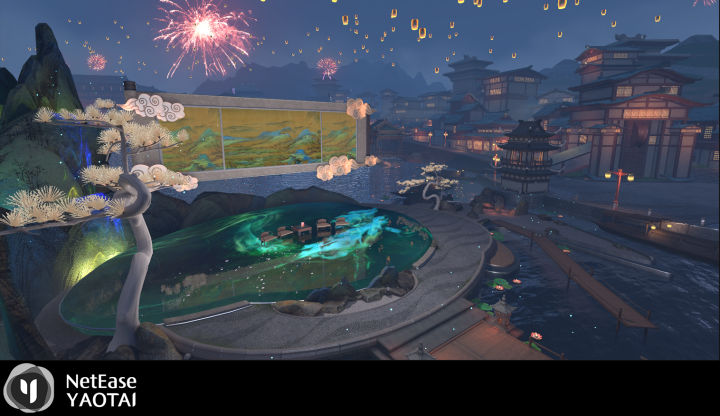 为进一步贴合主题,网易瑶台选择了中国风与时尚科技融合的国潮风格作为场景主题,以朱熹“风月无边”作为场景命题,从王希孟《千里江山图》中汲取色彩灵感,借此传达中国在元宇宙产业发展中的独特风格和扮演的重要角色。在基础场景的构建中,网易瑶台选择与网易热门游戏《逆水寒》、《天谕》进行合作,两款游戏基于网易游戏多年的美术能力沉淀和领先业内的国风、东方风格,为网易瑶台提供了许多高质量模型资产,也为美术团队快速实现论坛场景提供了强有力的支持。场景制作上,网易瑶台同样取师《逆水寒》、《天谕》,针对材质效果、场景特效、模型动画都进行了更进一步的技术升级,用户身处其中,视线近处,舞台瀑布于假山之上粼粼倾泻而下,水面花灯摇曳生姿;目极远处,夜空明月高悬,岸边团圆灯火辉映;礼花当空,更是“海上起烟浪,更有奇花次第悬,千枝随地生”,场景动静相合、更富意境。