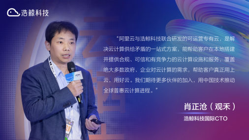在云栖大会的舞台,浩鲸科技国际CTO肖正沧受邀参加“专有云技术和应用实践论坛”发表主题演讲,并发布可运营专有云产品方案, 该方案基于阿里云底座和浩鲸科技云MSP在运营支撑域的深度积累, 为全球客户提供全场景的云计算业务运营服务。