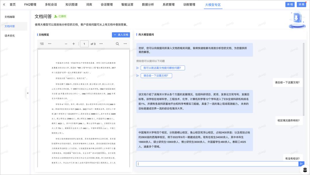 即人工或者机器人客服可以利用已经上传到后台的文档直接回答客户提问,大模型会根据语义和上下文沟通语境,迅速识别问题中的关键信息并调取最优答案呈现给客户,快速解决客户诉求。