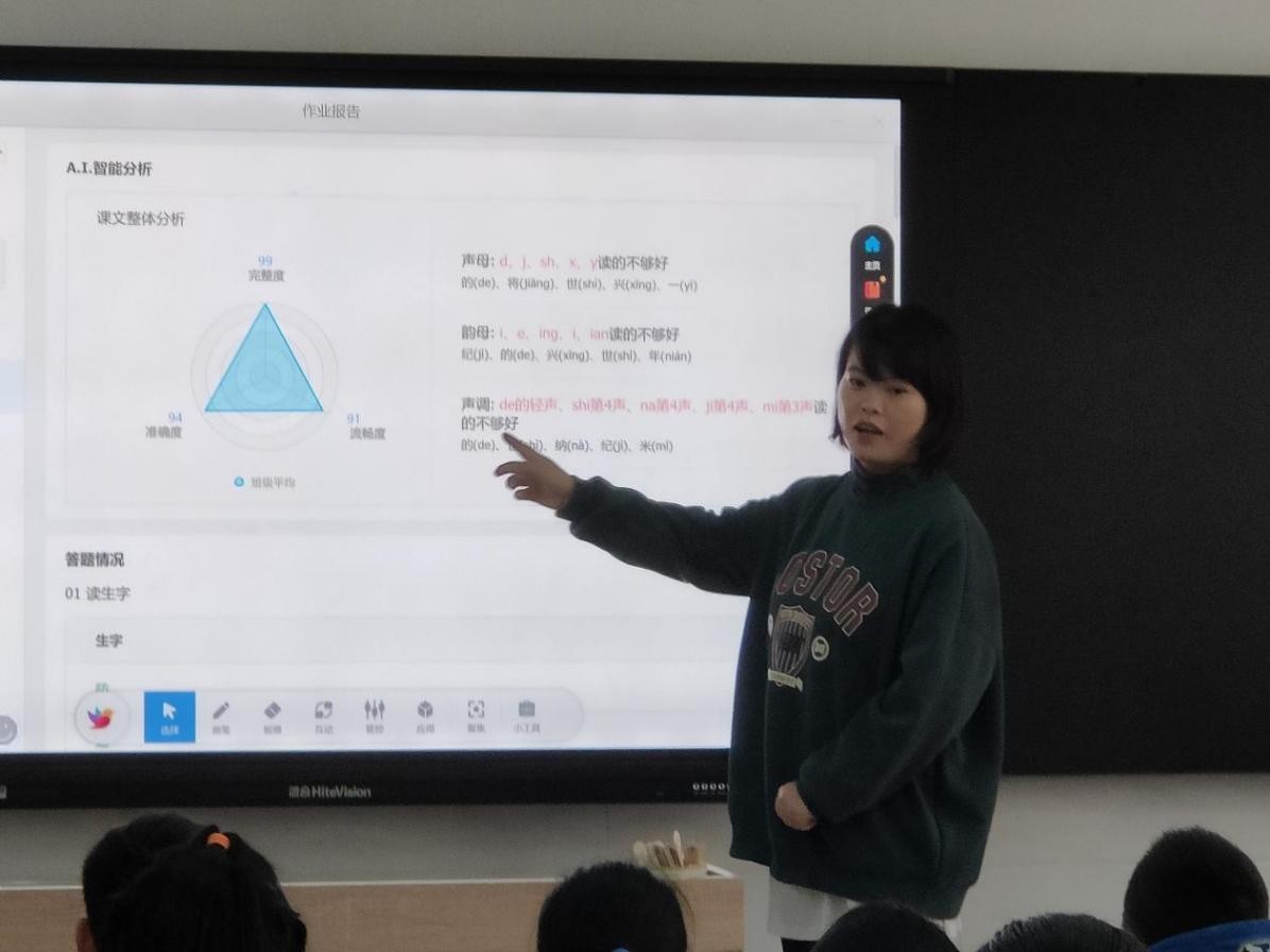 智慧教育赋能课前预习,为课堂教学作铺垫。在传统课前预习过程中,教师预习检测难,学生预习落实难,教师检查学生预习情况耗时耗力且不全面到位,学生容易形成钻空子的习惯,课前预习逐渐流于形式。面对以上问题,孙新玲老师利用“朗读训练”功能检测学生一类字、二类字、词语、课文的认读情况,该功能根据学生认读情况生成个人作业报告及全班作业报告,学生存在的问题一目了然,并实现及时订正,教师也清楚了解班级学情,在课堂教学中突破重难点,实现有的放矢,课前随机选取学生播放其认读情况,也有效避免了学生预习不认真等钻空子行为。