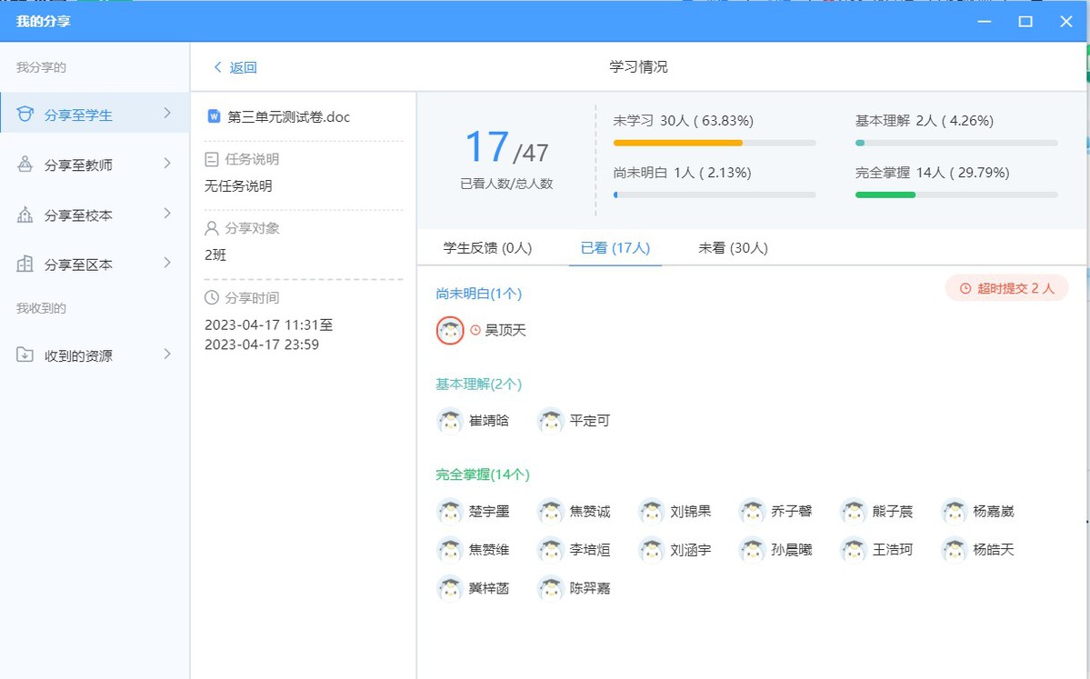 另外,孙新玲老师利用“分享”功能将课文作者介绍、背景知识以及文本学习特点等相关资料分享给学生,并查看学生学习情况,了解“未学习”、“基本理解”、“尚未明白”、“完全掌握”人数,为课堂教学提供了学情依据。比如,孙新玲老师在讲授爱国主题诗词《古诗三首》、梁启超《少年中国说》、《圆明园的毁灭》、《小岛》的时候,给学生分享了许多文字、图片、视频资料,学生借助资料进行课前感知、课后了解文章背景知识,深入体会了文中传递的爱国情感,课堂效果实现了显著提升。