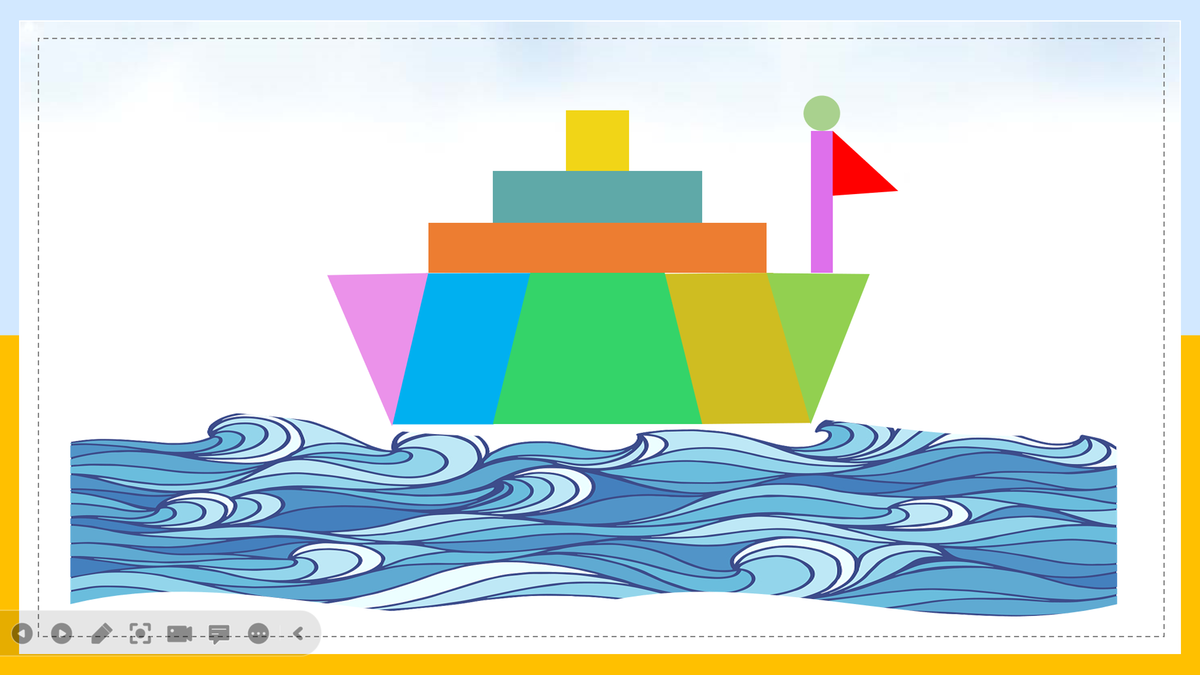 在课堂总结环节,通过确定打扫教室的范围知道了什么是面积,通过擦玻璃环节学会了比较面积大小的方法。教师利用多种图形设计出了一艘在大海中航行的船只,希望同学们能够在面积的知识海洋里面扬帆起航。