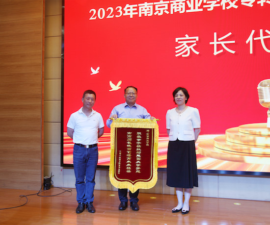 梦圆南商迈进大学殿堂、感恩师长助我展翅翱翔——在怀揣新的人生理想、开心却又伤感的分别时刻,家长和同学们给学校和老师赠送锦旗。红底金字,尽显老师对待学子的赤诚之心;鲜花满堂,彰显学生感恩之心芬芳绽放。