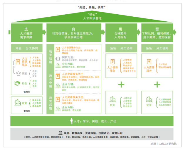 我们将人才生态供应链总结为“一核四环六角色”,即以人才实训基地为核心,围绕 选、育、用、留四个人力资源环节,由院校、企业、人力资源技能培训机构、社会资源、人才、政 府六个关键角色,实现人才供应的精准化、生态化。