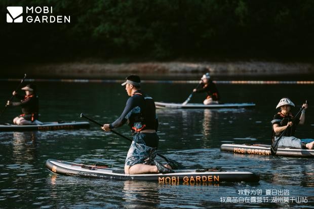牧高笛超轻桨板的板身流线型设计搭配缓冲头细节,让湖面划行更加平稳。逐浪人们在教练的指导下,经过一次次的尝试,从“我不敢”到“我可以”,最终掌握平衡,完成挑战,尽情体验“划水”的快乐。