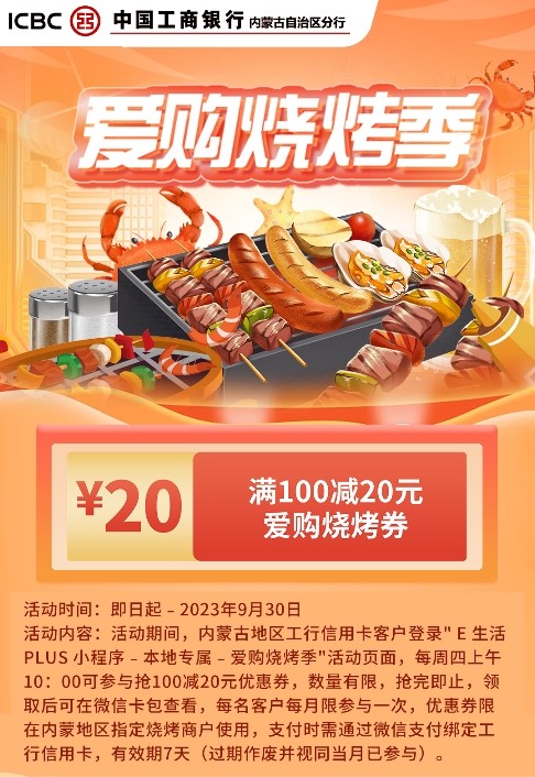至9月30日每周四上午10:00,内蒙古地区工行信用卡客户可在“e生活PLUS”微信小程序“本地专属”-“爱购烧烤季”活动页面领取20元烧烤券,有效期内在全区各盟市指定烧烤商户消费时使用微信绑定工行信用卡支付,即可享受满200元立减20元优惠。每位客户每月可领取一次,数量优先,先到先得。