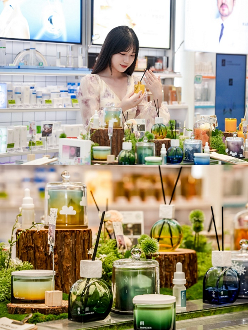 随着当下年轻消费者群体对情感疗愈和品质生活的需求日益增长,香氛等融合情绪和功能价值的产品备受青睐。因此,新店首设香氛区,草木、藤蔓与花束的淡雅馥郁交织,宛如一座自然秘境,营造自然、清新的舒适氛围。不同品牌的香水、香氛宛如艺术品般错落有致陈设其中,移步异景,让消费者沉浸在疗愈身心的香氛世界里尽情试香,感受视觉、嗅觉、触觉多重感官体验。
