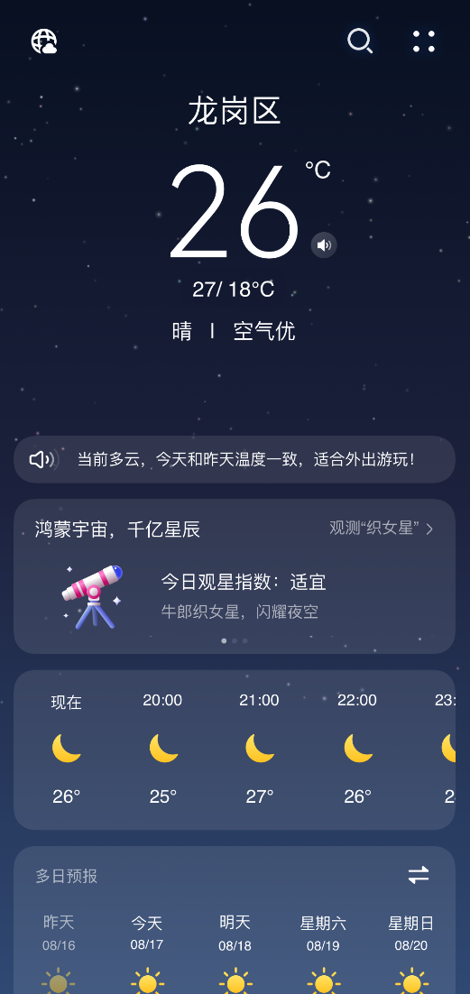 两个人的日常相处中,不管是不是过节,都要主动创造小温馨和仪式感,为生活增添甜蜜!将华为天气万能卡片添加到TA的手机桌面,时刻提醒天气变化,爱就在生活的细节里。值得一提的是,华为天气还有一个浪漫小功能——观星指南。七夕期间,如果天气条件较适宜观星,无需手动添加,就会在天气APP首页出现观星卡片,提醒你在夜晚带着TA一起寻找牛郎星和织女星,还有什么比一起仰望星空更浪漫的事!