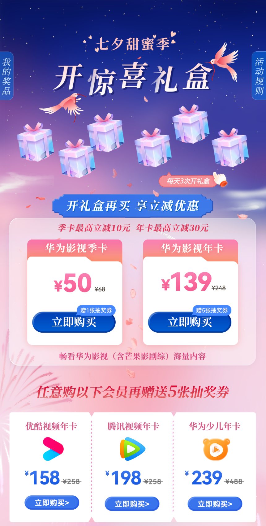 对于i人情侣来说,远离嘈杂的商场和人群,待在小家追一部喜欢的电影不失为最舒适的约会方式。华为视频囊括华为影视(含芒果TV影剧综)、优酷、腾讯视频等平台的海量视频资源,一个APP即可畅享《白日梦我》、《我爱你》、《长相思第一季》、《心动的信号第七季》等暑期热播影剧综。七夕期间华为视频还为大家带来了惊喜好礼,用户每天进入活动页即可获得3次开礼盒机会,赢5-30元会员立减券等...有时候,告别嘈杂的影院也挺好,和TA一起静静地沉浸在一部精彩电影中,两个人都能刚好能听到对方心跳的声音,让爱情瞬间升温!