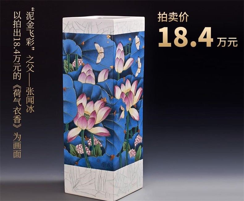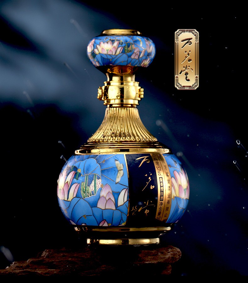 瓶身画面以“泥金飞彩”之父张闻冰、拍出18.4万元的《荷气衣香》为原型创作,完美呈现张闻冰陶瓷镶器《荷气衣香》的神韵,画面中有荷花、有苍穹、有彩蝶,还有各式各样的在天地间象征万物生长的各种景色,呈现了一种晚风清凉,碧荷芳华的意境,整体给人一种出淤泥而不染的高尚情怀。